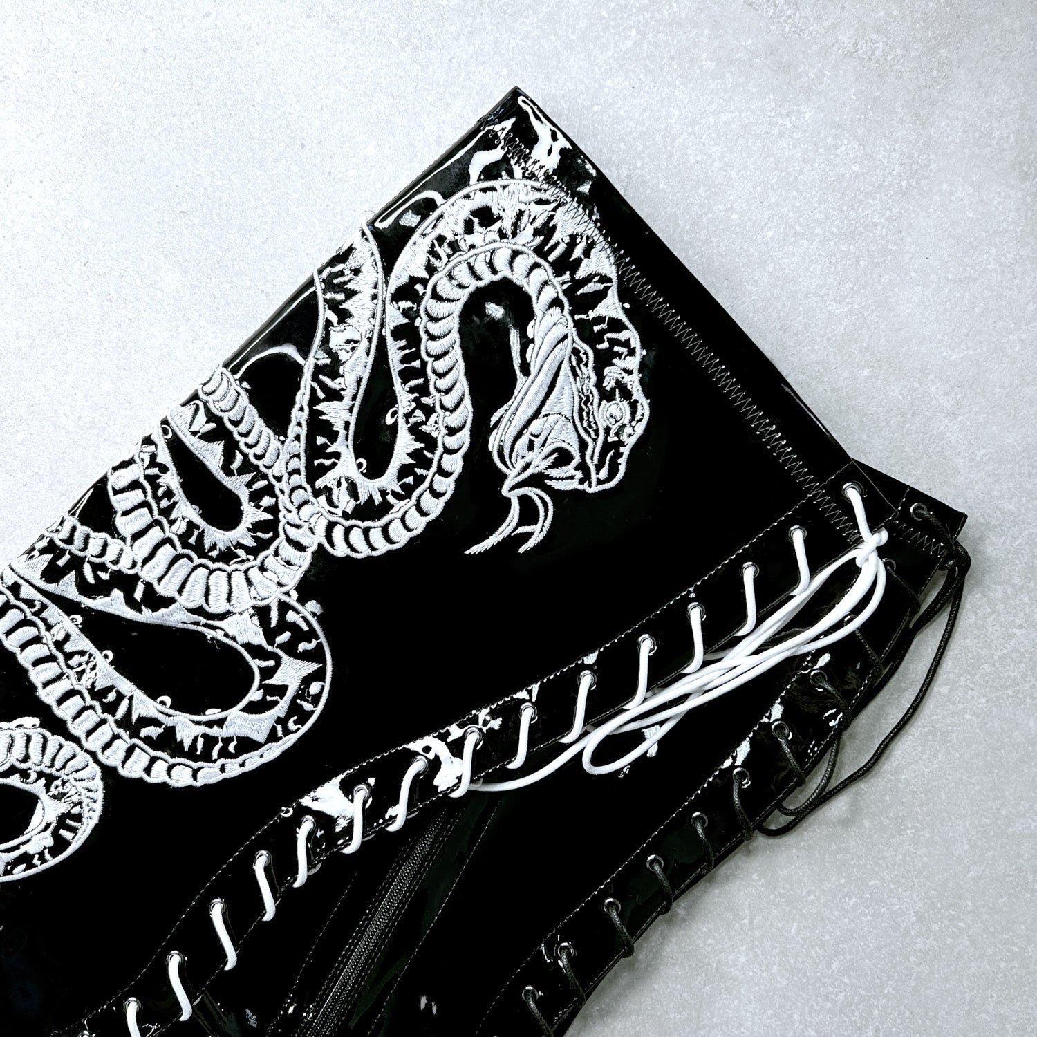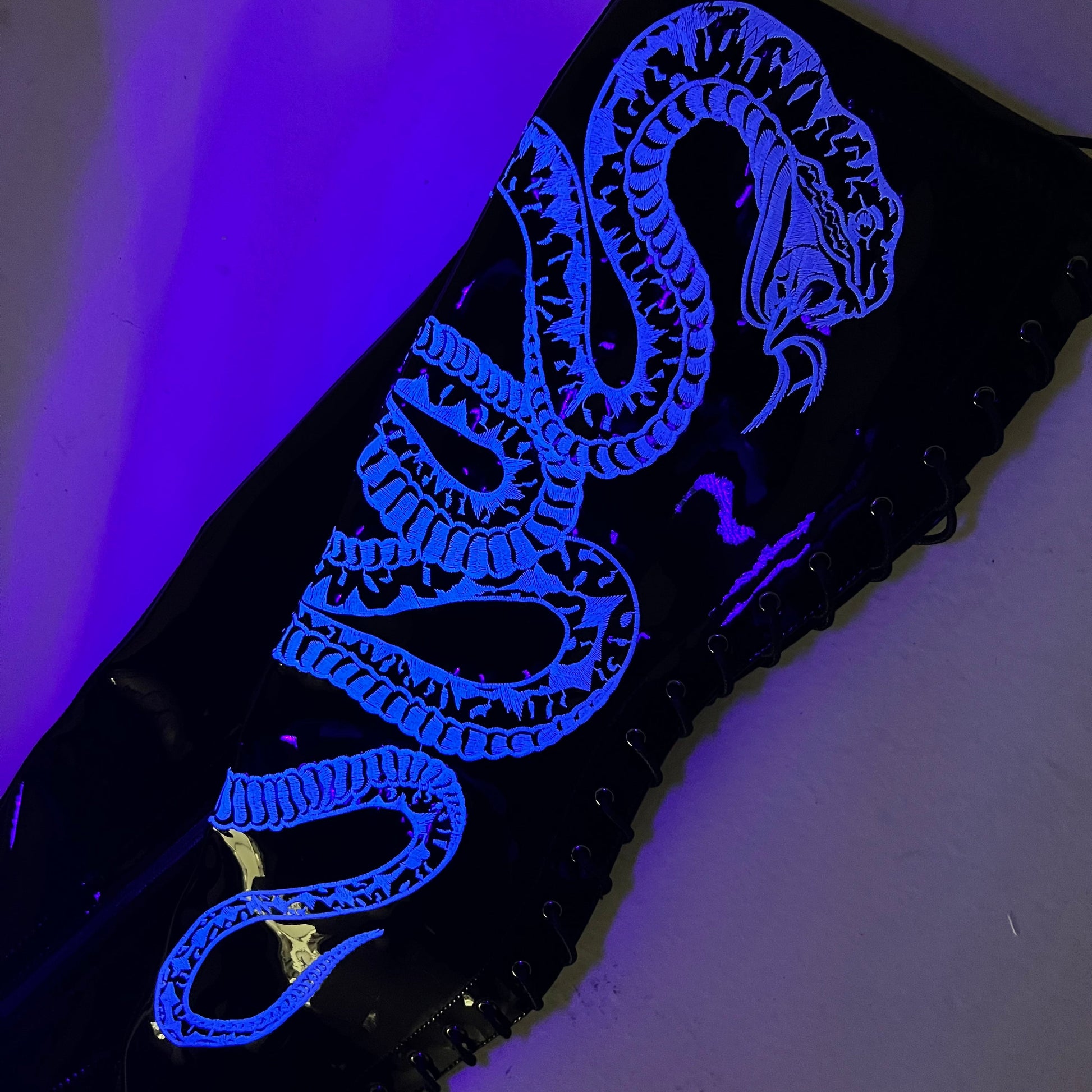 Kissed by the ink of tattoo-inspired art, an embroidered White Viper wraps around your leg with stitching that GLOWS in the blue light - [signalling that you’re not the one to be messed with!]Β